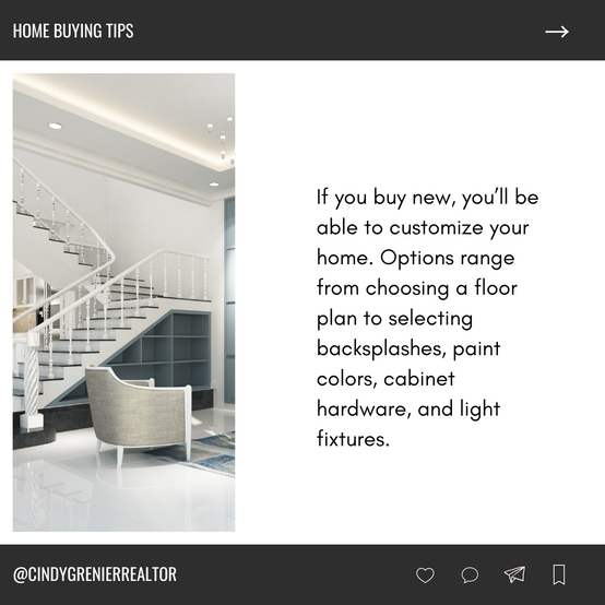 If you buy new, you’ll be able to customize your home. Options range from choosing a floor plan to selecting backsplashes, paint colors, cabinet hardware, and light fixtures.